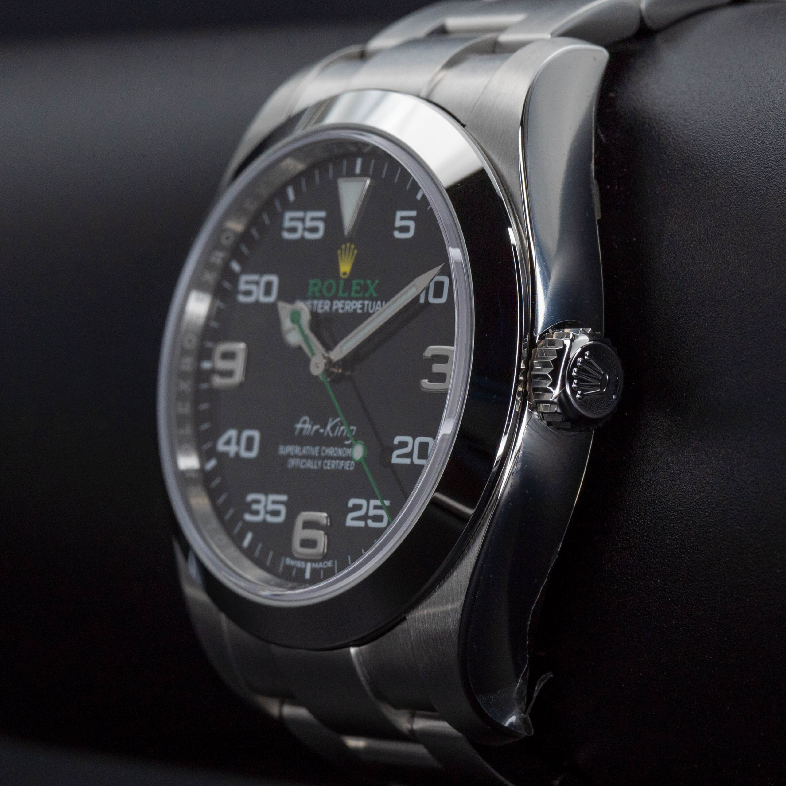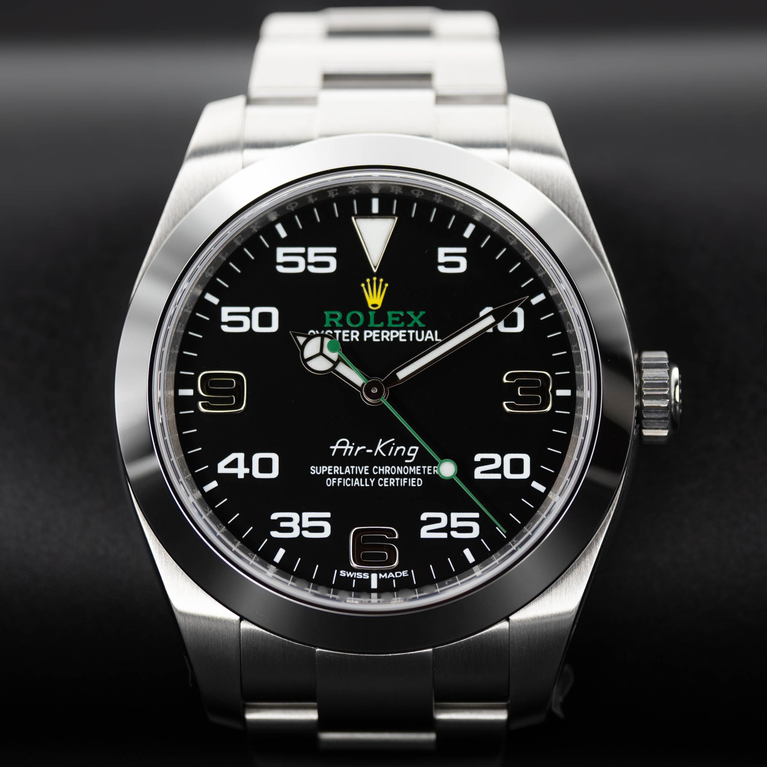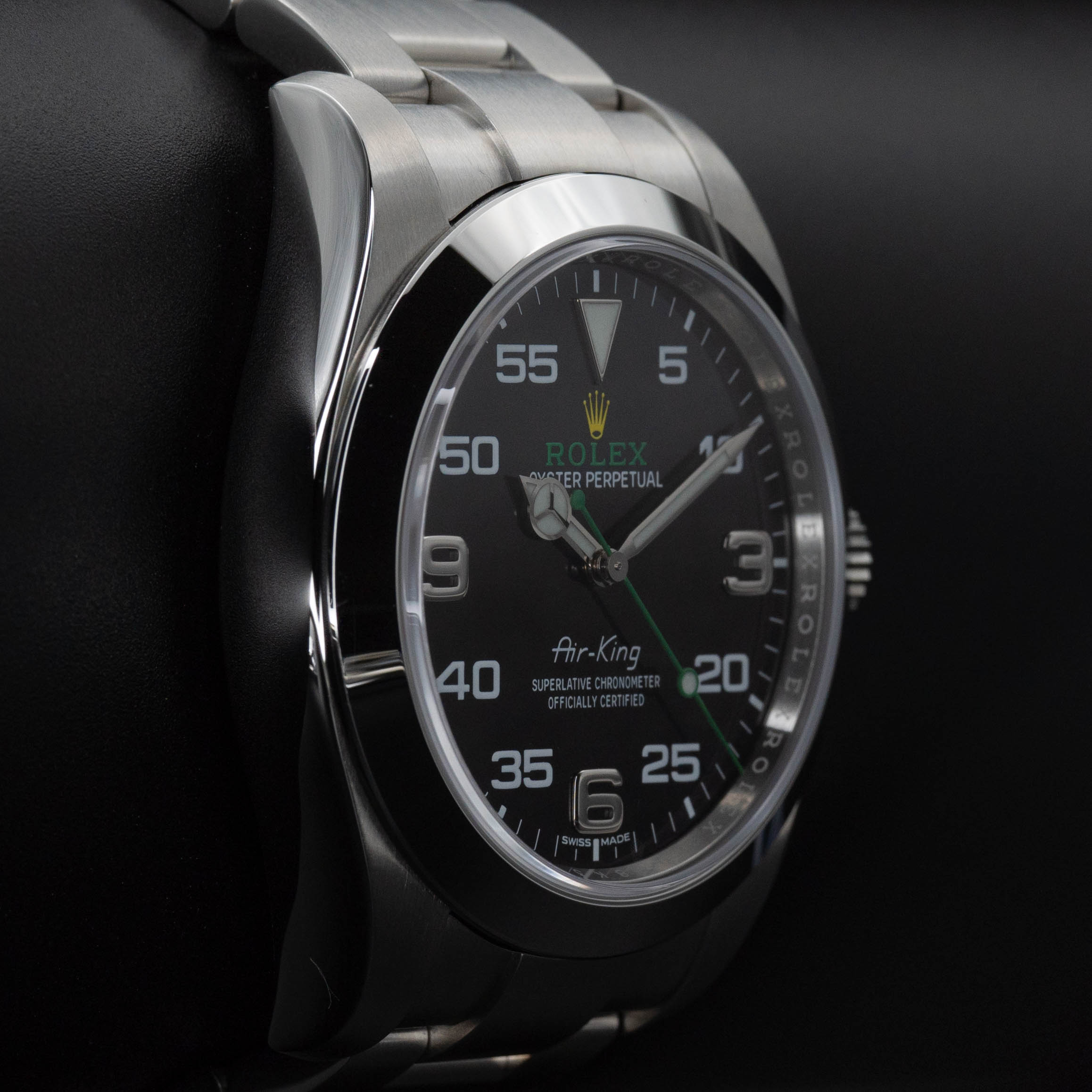 With its 40 mm case in Oystersteel, solid-link Oyster bracelet, and distinctive black dial, the Air-King perpetuates the aeronautical heritage of the original Rolex Oyster.