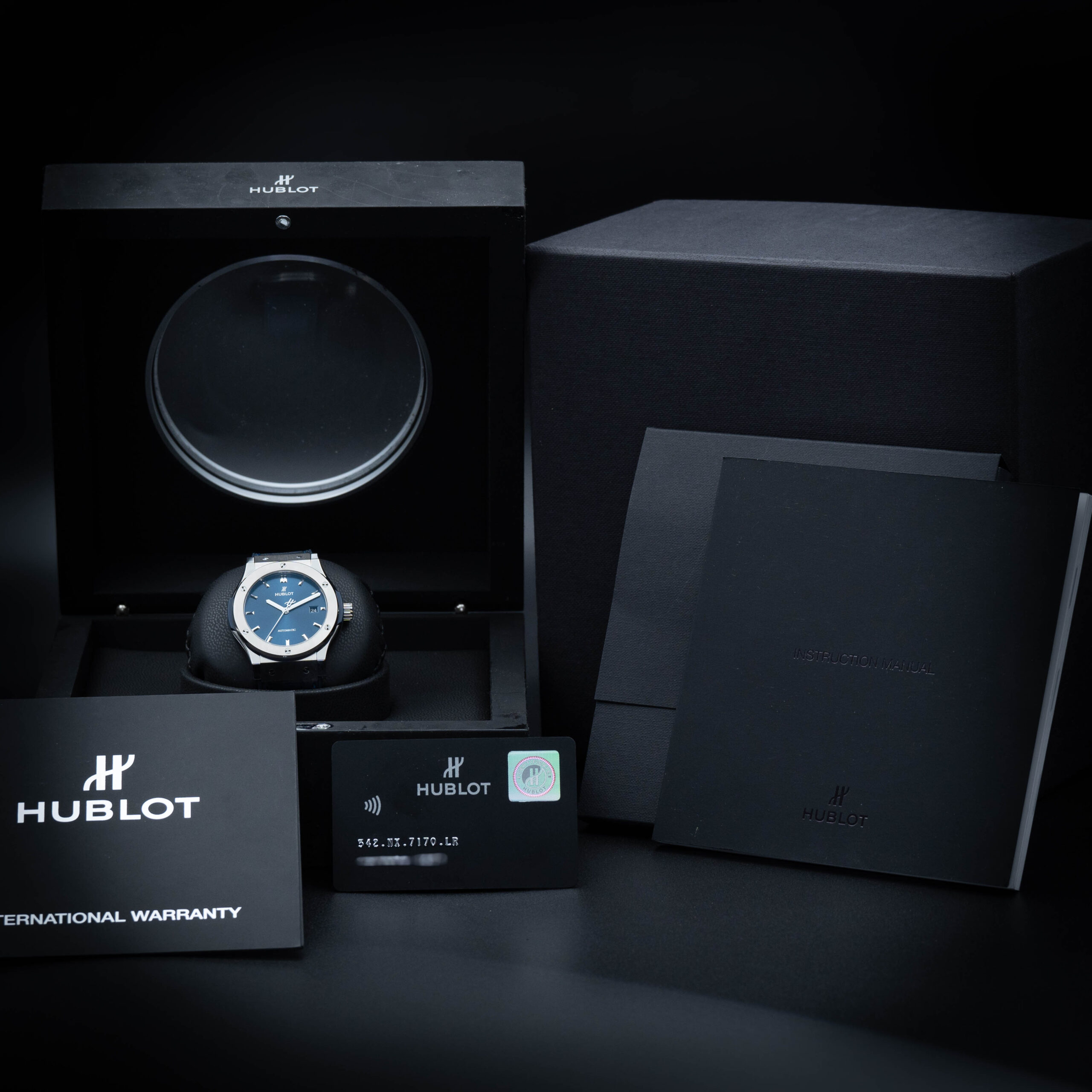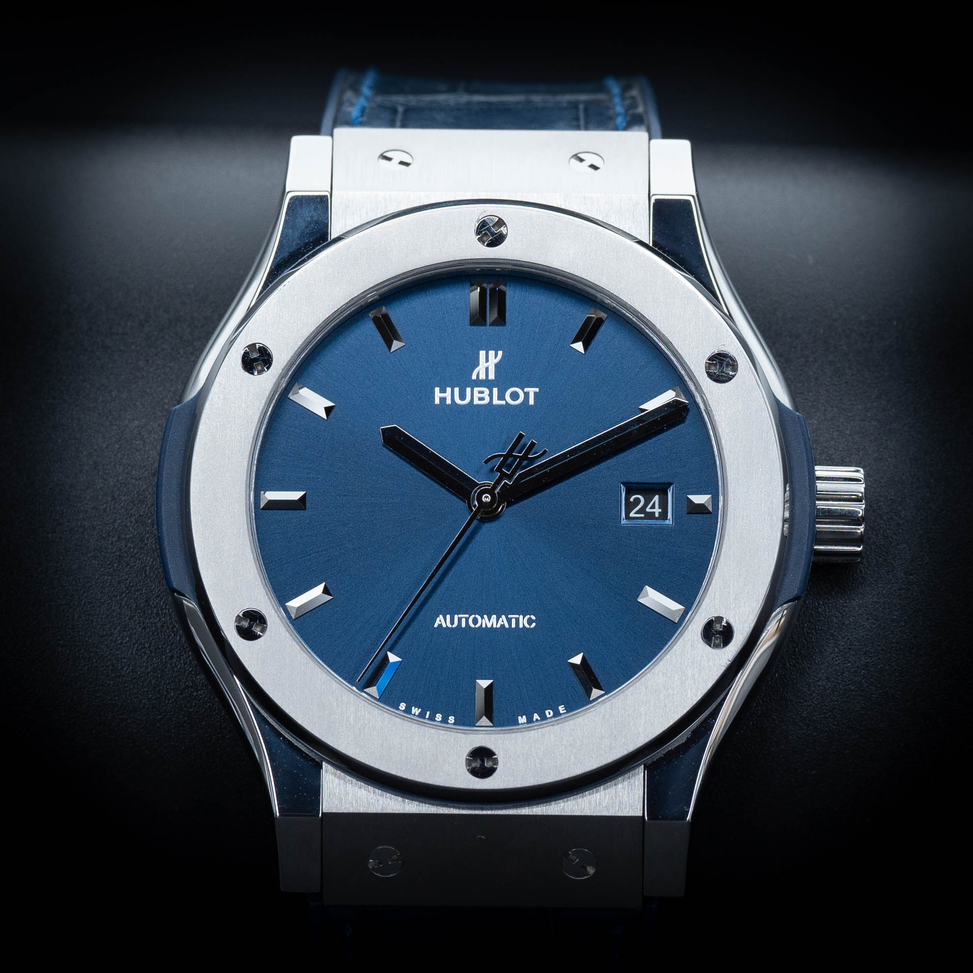 Elevate your wrist game with this stunning Swiss-made timepiece. Featuring a 42mm satin-finished titanium case, a striking blue sunray dial, and a luxurious blue rubber strap with alligator leather inlay, this watch blends modern elegance with sporty sophistication. Powered by the Hublot Calibre HUB1110 automatic movement, it offers a 42-hour power reserve and water resistance up to 50 meters. Complete with a scratch-resistant sapphire crystal and skeleton case back, this Classic Fusion is a true statement of refined taste.
