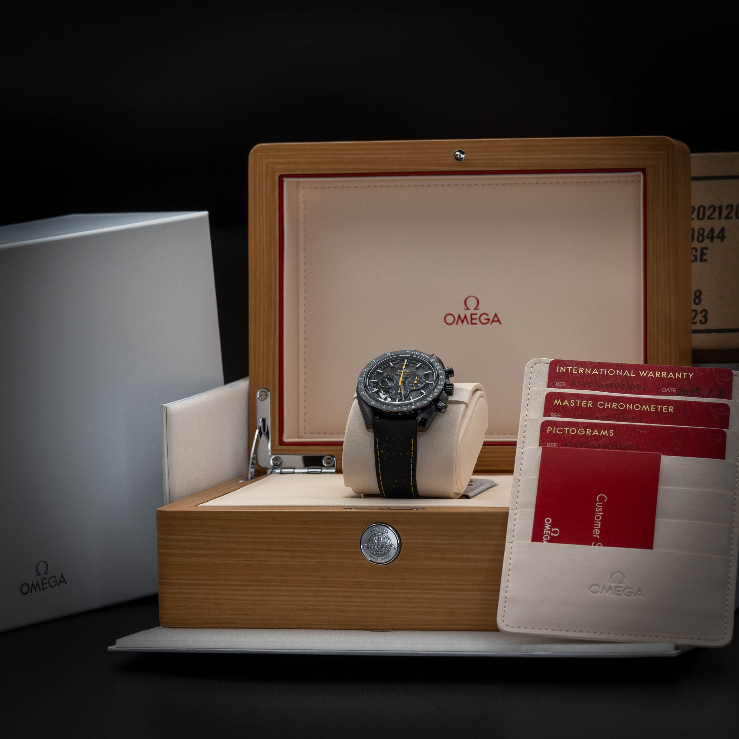 Celebrate lunar legacy with the Omega Speedmaster Apollo 8, a bold 44.25mm chronograph crafted entirely in black ceramic. This “Dark Side of the Moon” edition features a skeletonized black anodized aluminum dial revealing a laser-ablated movement designed to resemble the moon’s surface—visible from both front and caseback. Yellow accents, including a Saturn V rocket-shaped small seconds hand, add a vibrant contrast. Powered by the manual-winding Co-Axial Master Chronometer Calibre 3869, it offers METAS-certified precision, magnetic resistance, and a 50-hour power reserve. Finished with a perforated black rubber strap and engraved caseback, this timepiece is a tribute to space exploration and horological innovation